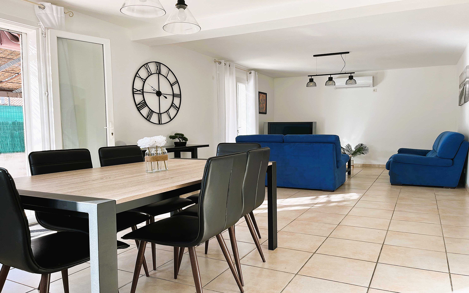 Pièce centrale de la maison, le salon salle à manger se situe entre la terrasse et la cuisine.Il est composé de 2 canapés, d’une TV écran plat, d’une table basse et d’une table à manger.