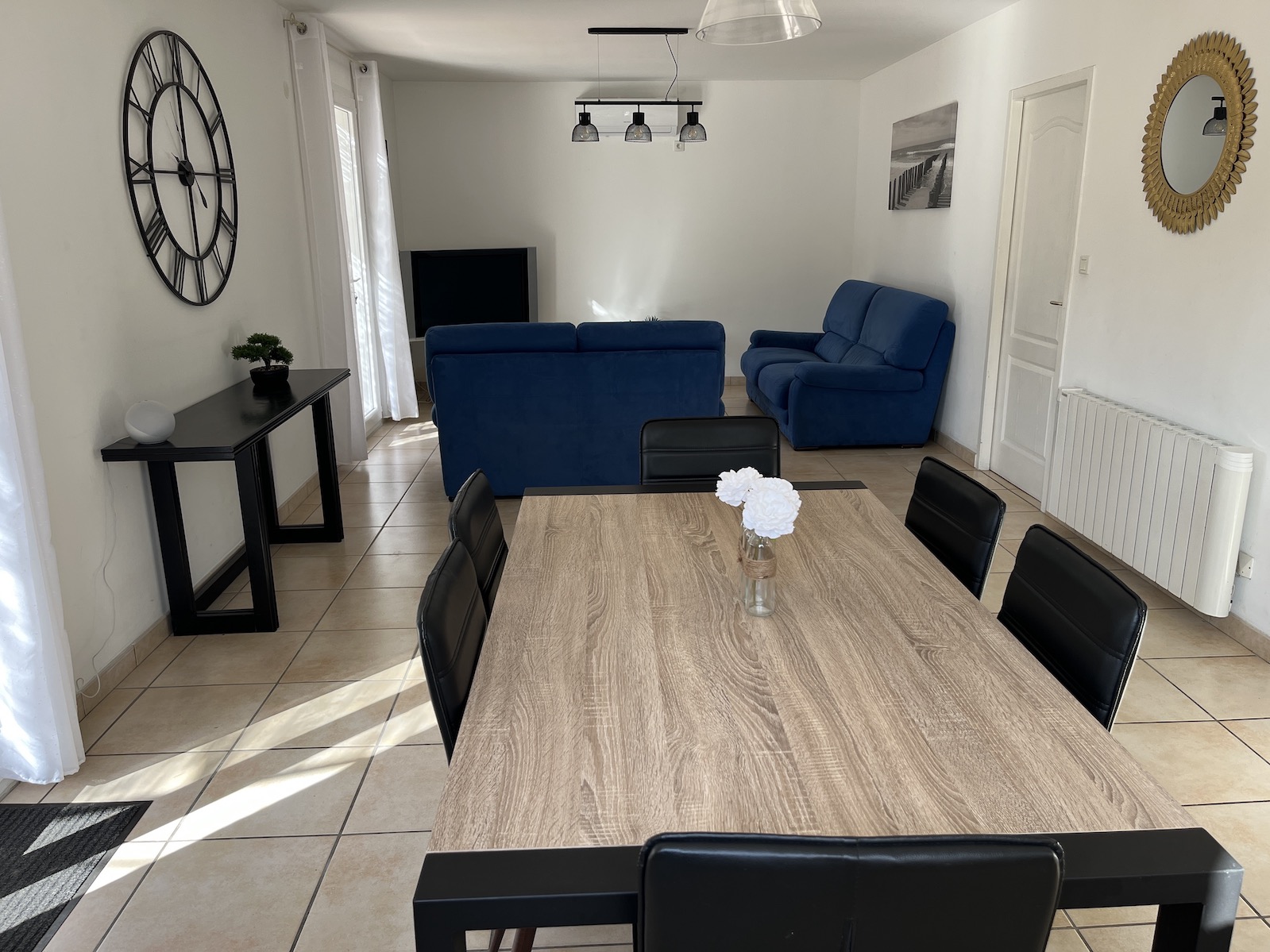 Pièce centrale de la maison, le salon salle à manger se situe entre la terrasse et la cuisine.Il est composé de 2 canapés, d’une TV écran plat, d’une table basse et d’une table à manger.